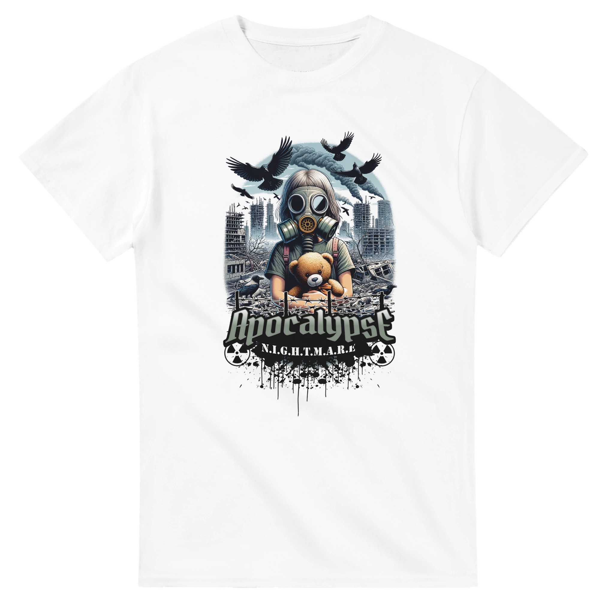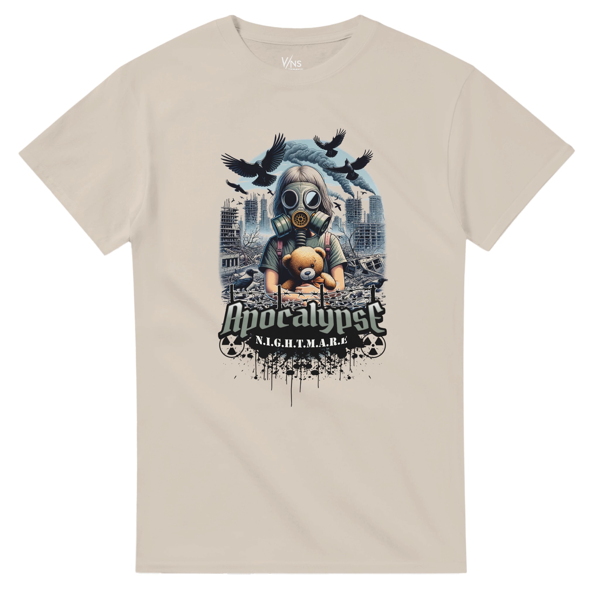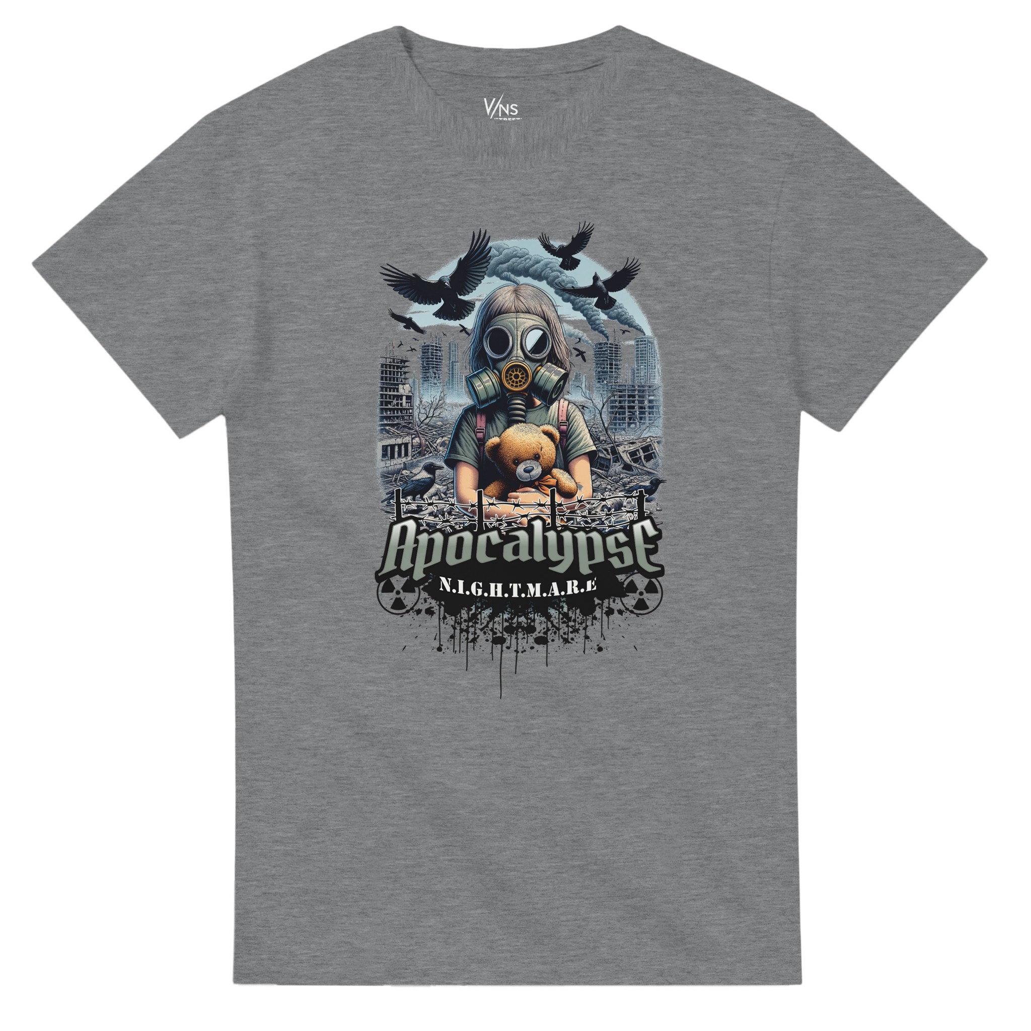 Das „Apocalypse Nightmare“-Shirt zeigt eine düstere Szene mit Gasmaskenfigur, Krähen und zerstörter Welt – ein starkes Motiv zwischen Endzeitästhetik, Dystopie und Streetwear. Ideal für alle, die sich modisch vom Mainstream absetzen und postapokalyptische Vibes feiern.