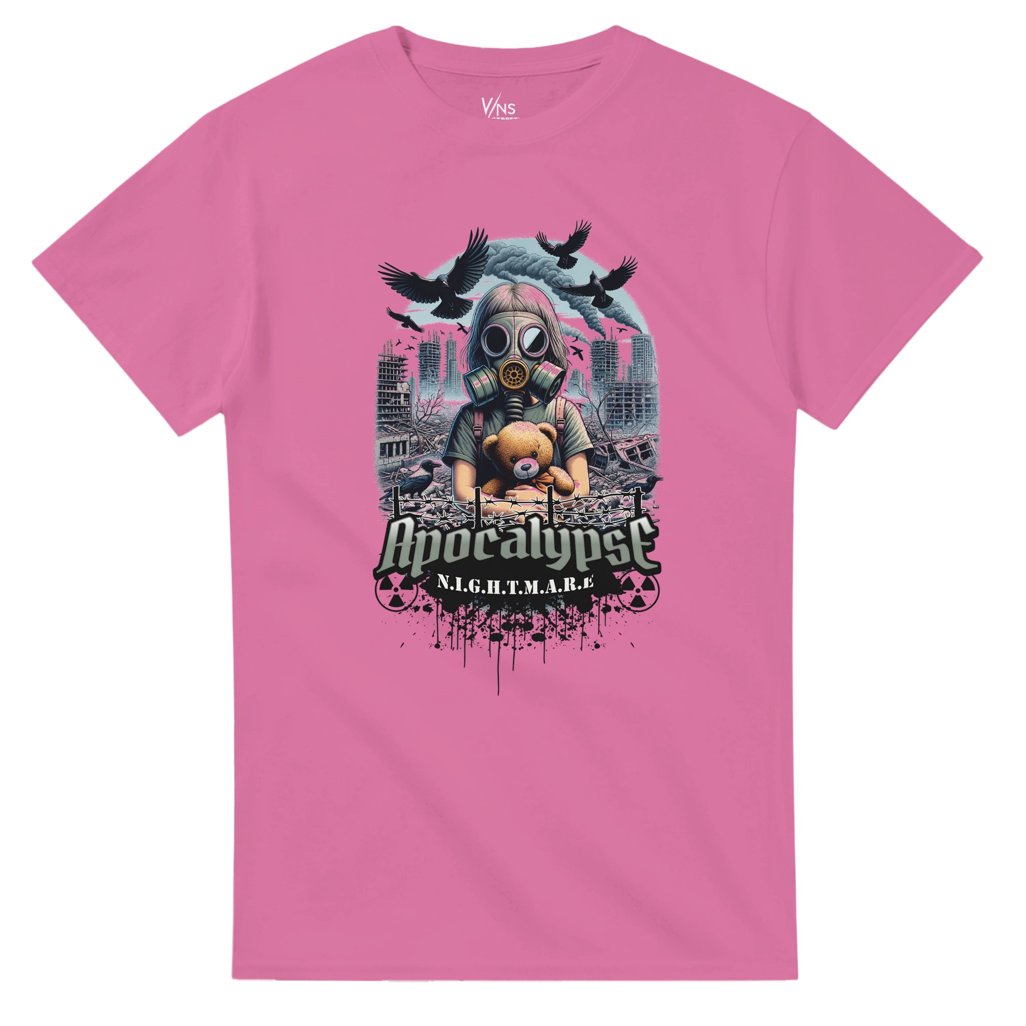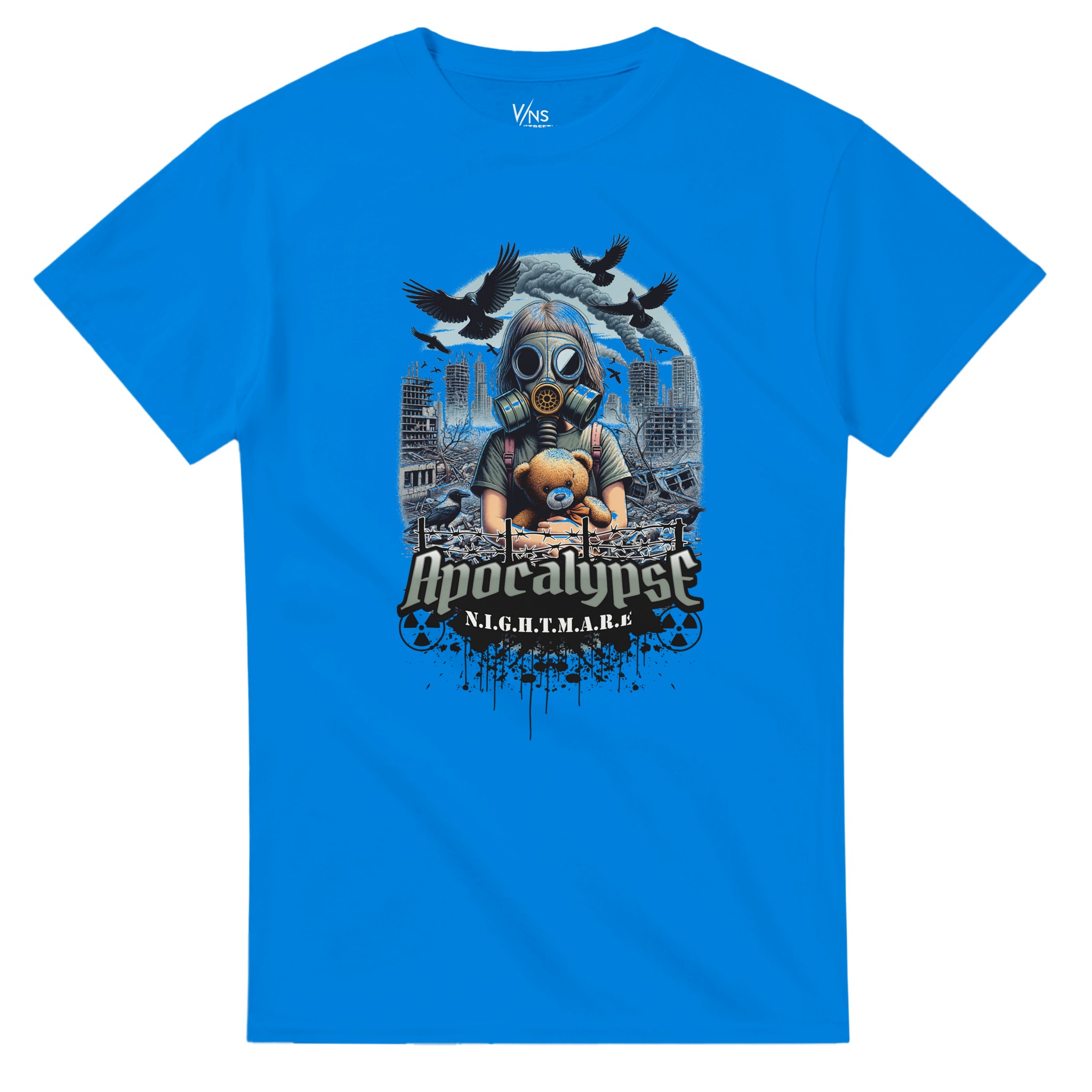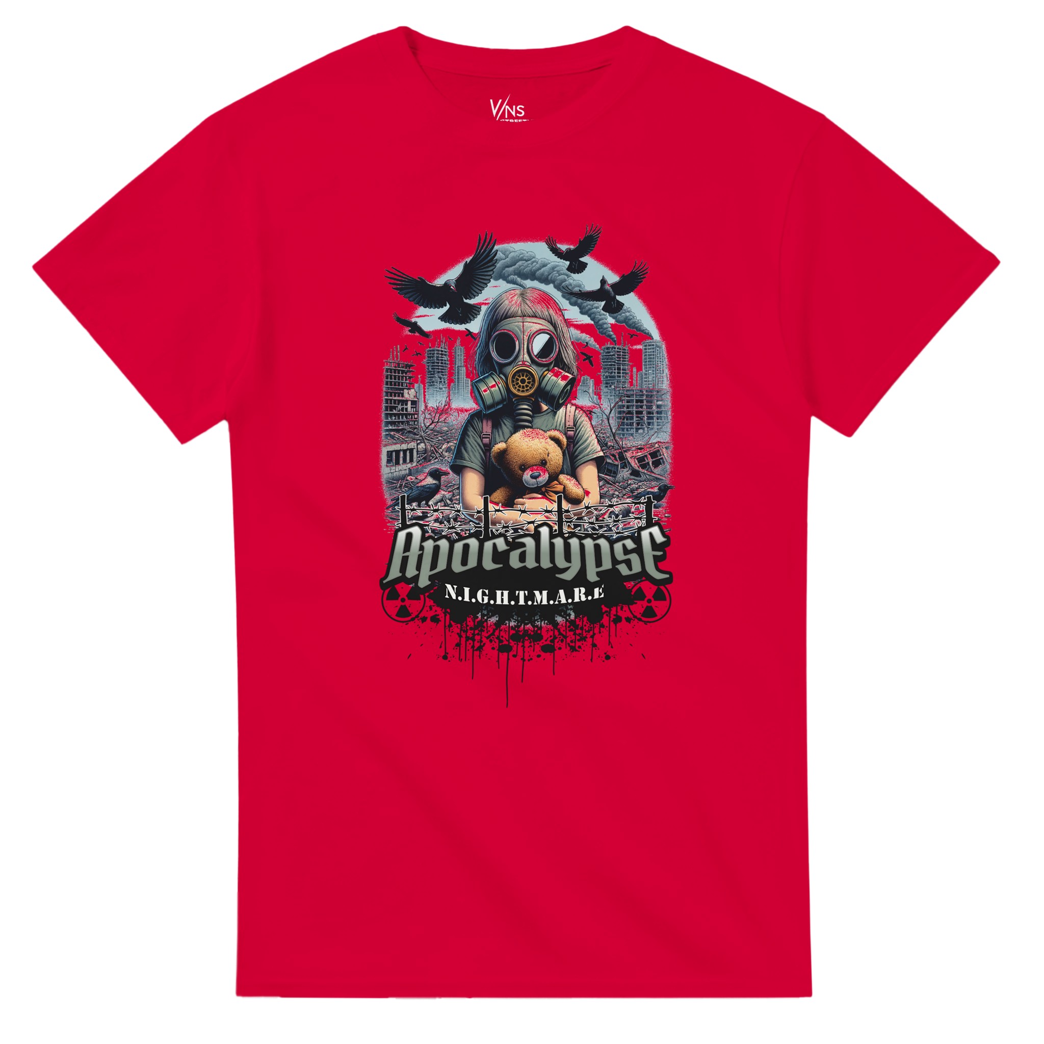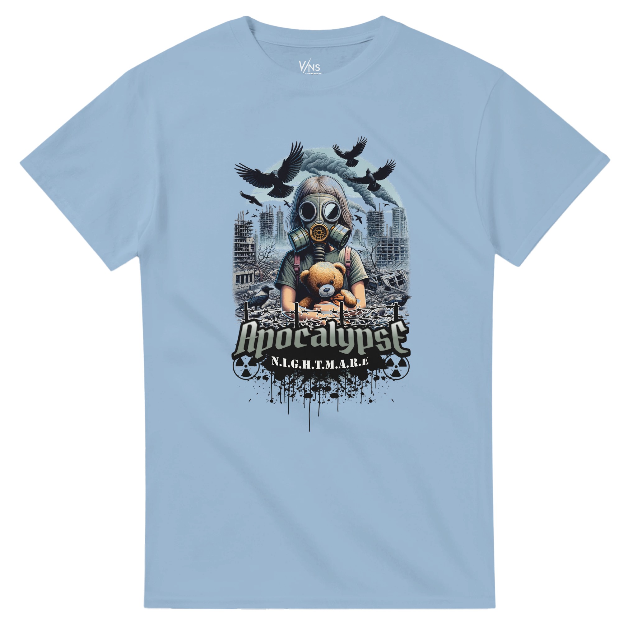 Das „Apocalypse Nightmare“-Shirt zeigt eine düstere Szene mit Gasmaskenfigur, Krähen und zerstörter Welt – ein starkes Motiv zwischen Endzeitästhetik, Dystopie und Streetwear. Ideal für alle, die sich modisch vom Mainstream absetzen und postapokalyptische Vibes feiern.