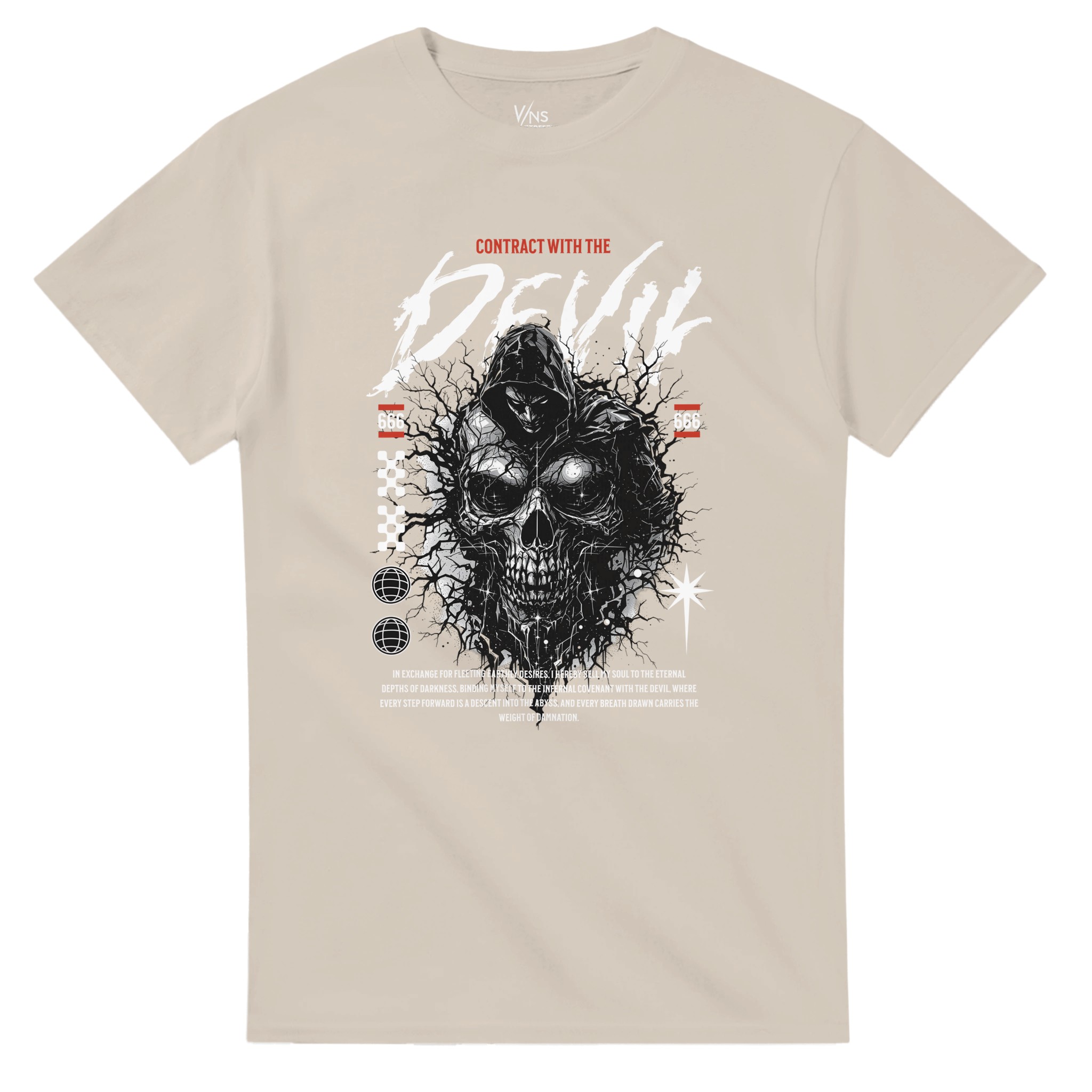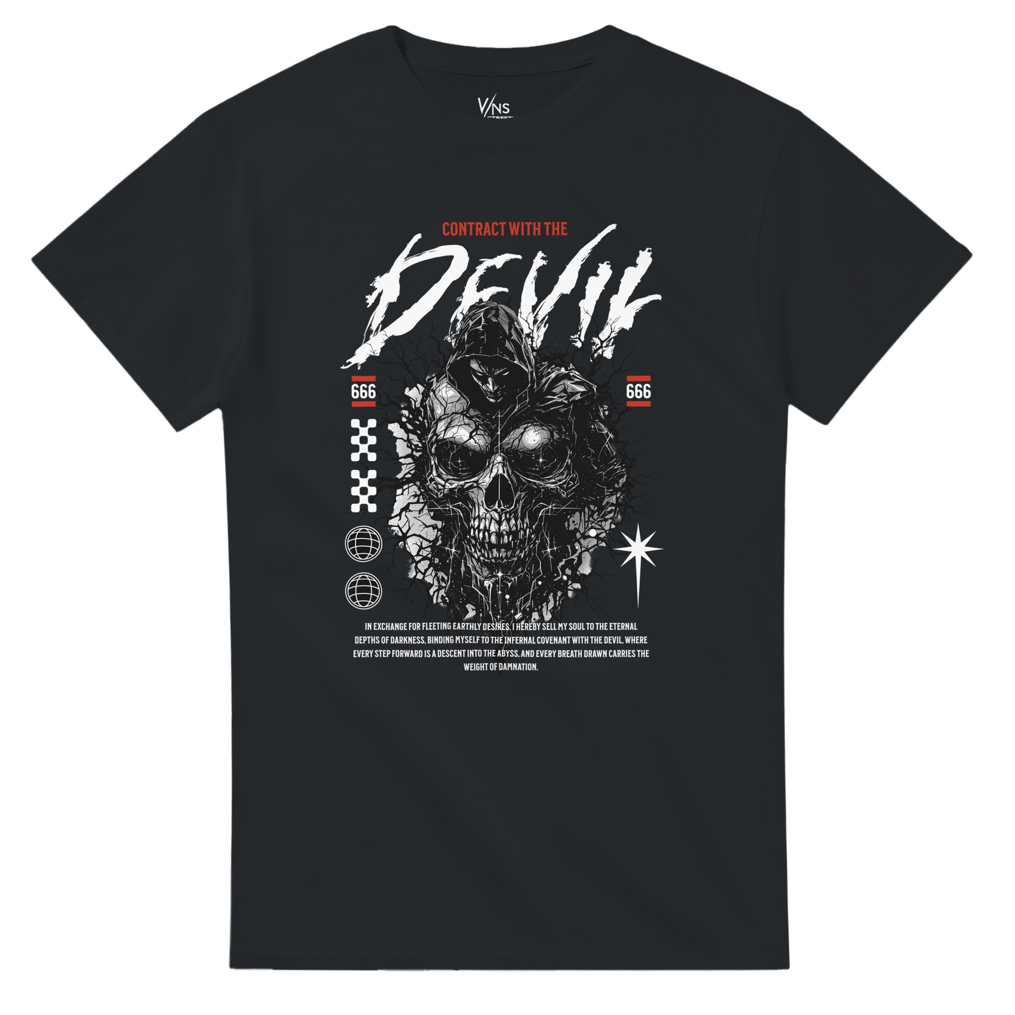 Dieses Shirt ist nichts für Zartbesaitete – das „Contract with the Devil“-Design kombiniert apokalyptische Symbolik, Totenkopf-Motiv und okkulte Elemente zu einem kompromisslosen Streetwear-Statement. Der grob gerenderte Schriftzug, die düsteren Icons und die 666-Details verleihen dem Motiv einen Industrial-Flair, der perfekt in jede Darkwear- oder Metal-Garderobe passt.